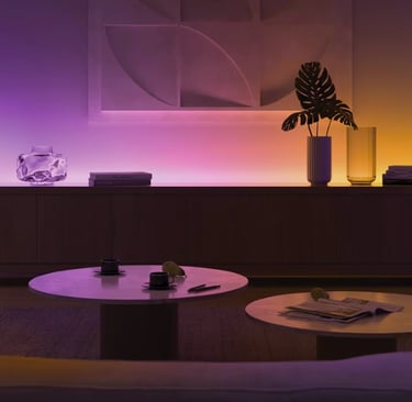 Combineer functioneel en sfeerlicht: gebruik GU10-spots (witte tinten) voor het bord en Hue Play/Lightstrip voor ambience.